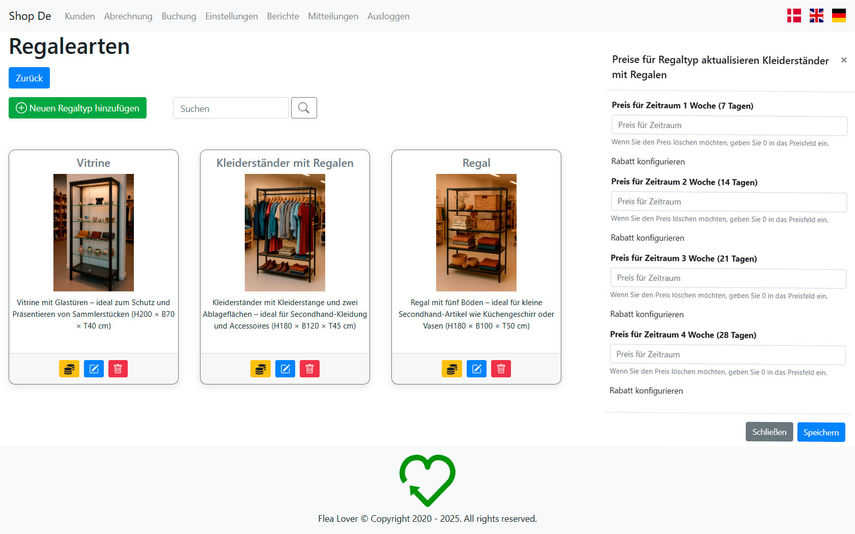 Unter Regalarten können Sie verschiedene Arten von Regaleinheiten erstellen, die Kunden buchen können, wie zum Beispiel Vitrinen, Regaleinheiten und andere ähnliche Optionen. Durch Klicken auf die gelbe Schaltfläche können Sie ganz einfach Preise hinzufügen. Sie müssen nicht für alle Mietzeiträume Preise festlegen und können auch Rabatte hinzufügen, die innerhalb eines bestimmten Datumsbereichs angewendet werden können.