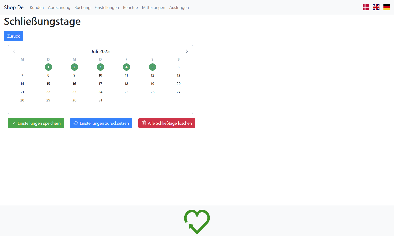Es gibt auch die Möglichkeit, spezielle Schließtage festzulegen, an denen Sie außergewöhnliche Tage angeben können, an denen der Laden geschlossen ist. Wählen Sie die Daten aus und klicken Sie auf ‚Einstellungen Speichern‘. Wenn ein Buchungszeitraum einen Schließtag enthält, wird die Buchung automatisch entsprechend verlängert.