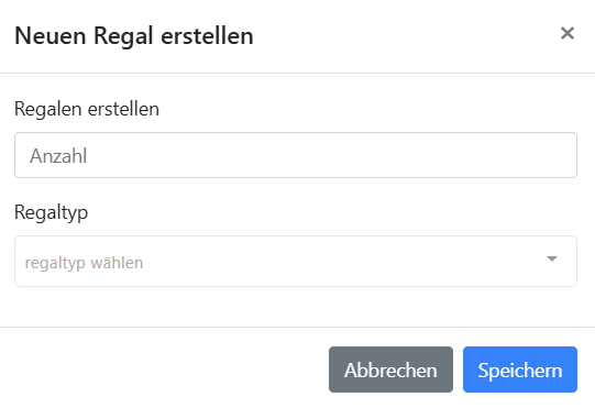 Wenn Sie auf ‚Regale generieren‘ klicken, erscheint ein Fenster. Bitte wählen Sie den Regaltyp aus, geben Sie die gewünschte Anzahl der zu generierenden Regale ein und klicken Sie auf ‚Speichern‘.