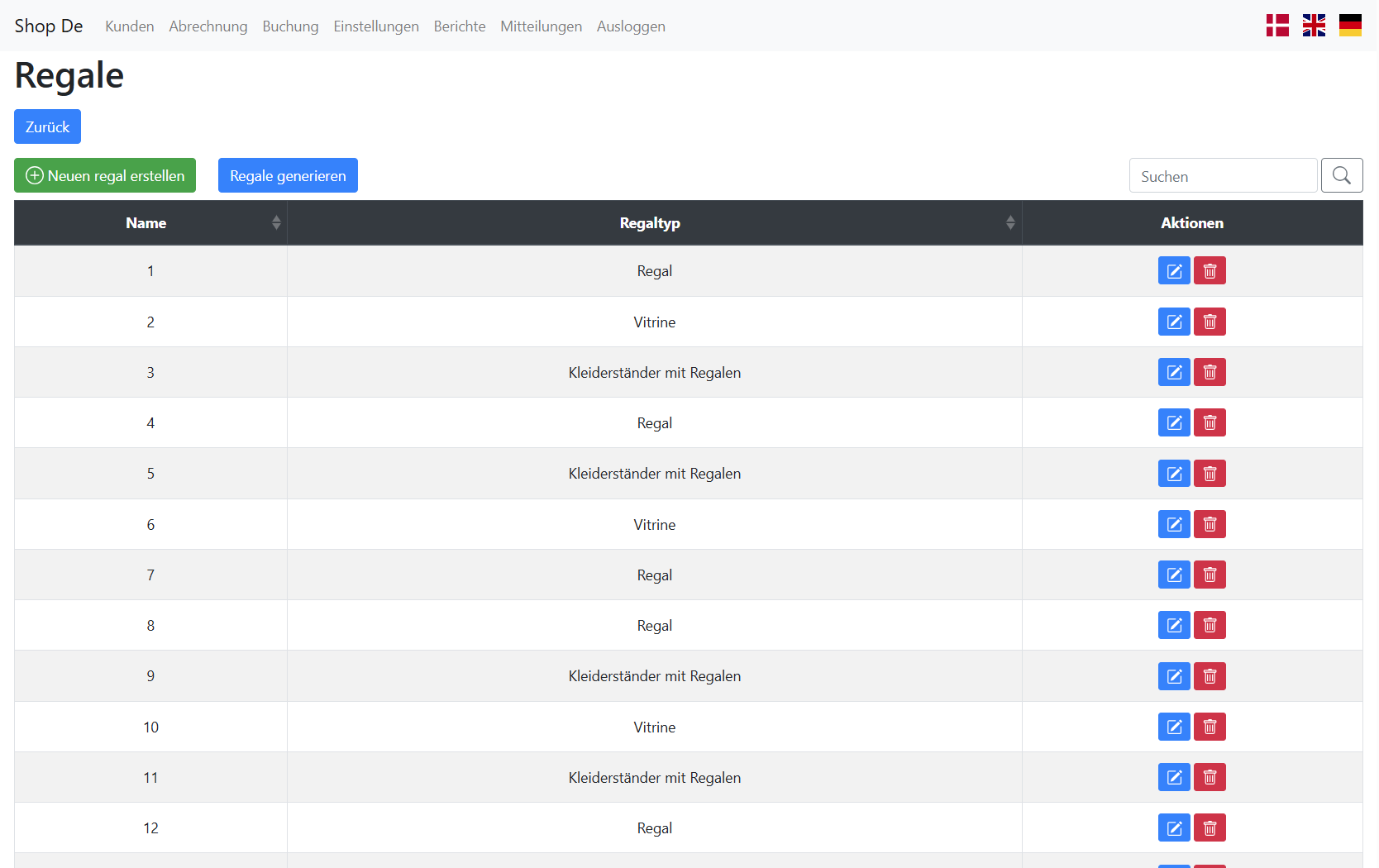 Sie haben 15 Regale erstellt. Wenn Sie den Namen ändern möchten, können Sie auf das blaue Stiftsymbol klicken und den Namen des Regals bearbeiten.