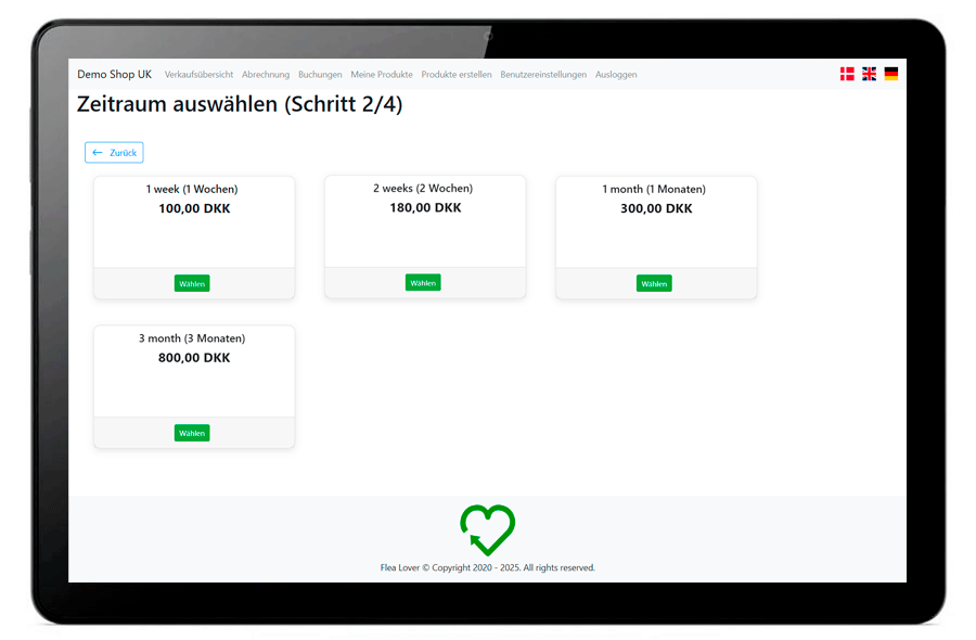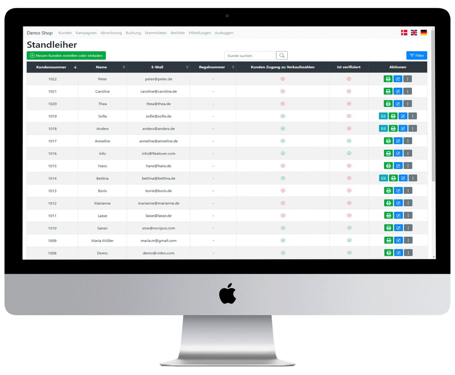 Flea Lover bietet eine vollständige Funktionspalette, um Kunden, Produkte, Buchungen und Auszahlungen zu verwalten. Sie können Kunden einladen, über Web-Login oder Apps für iOS und Android auf das System zuzugreifen, sodass sie ihre Verkäufe jederzeit ganz einfach verfolgen können!