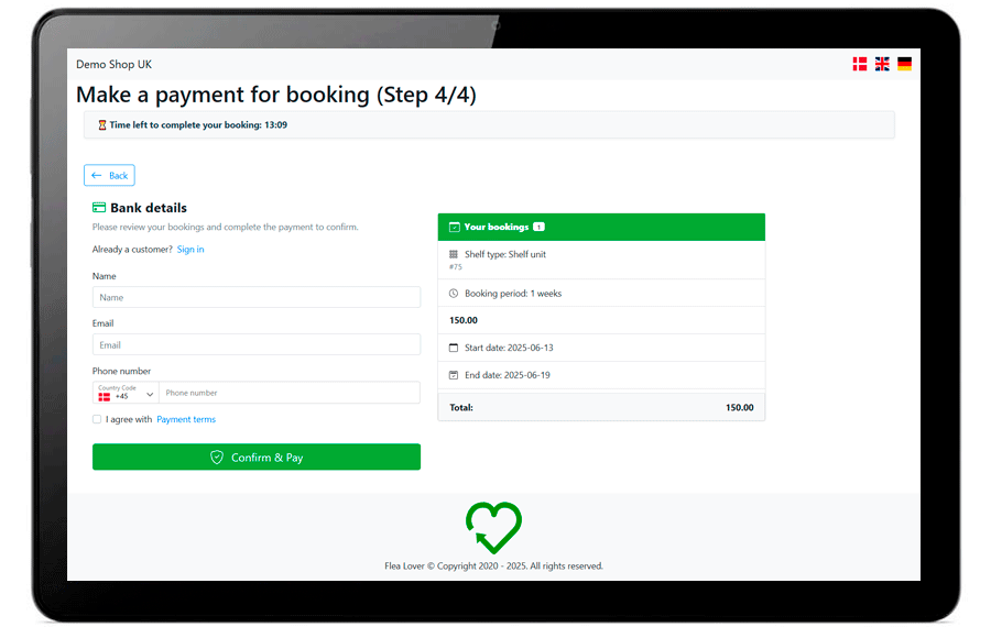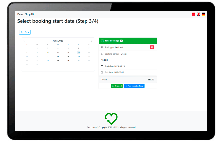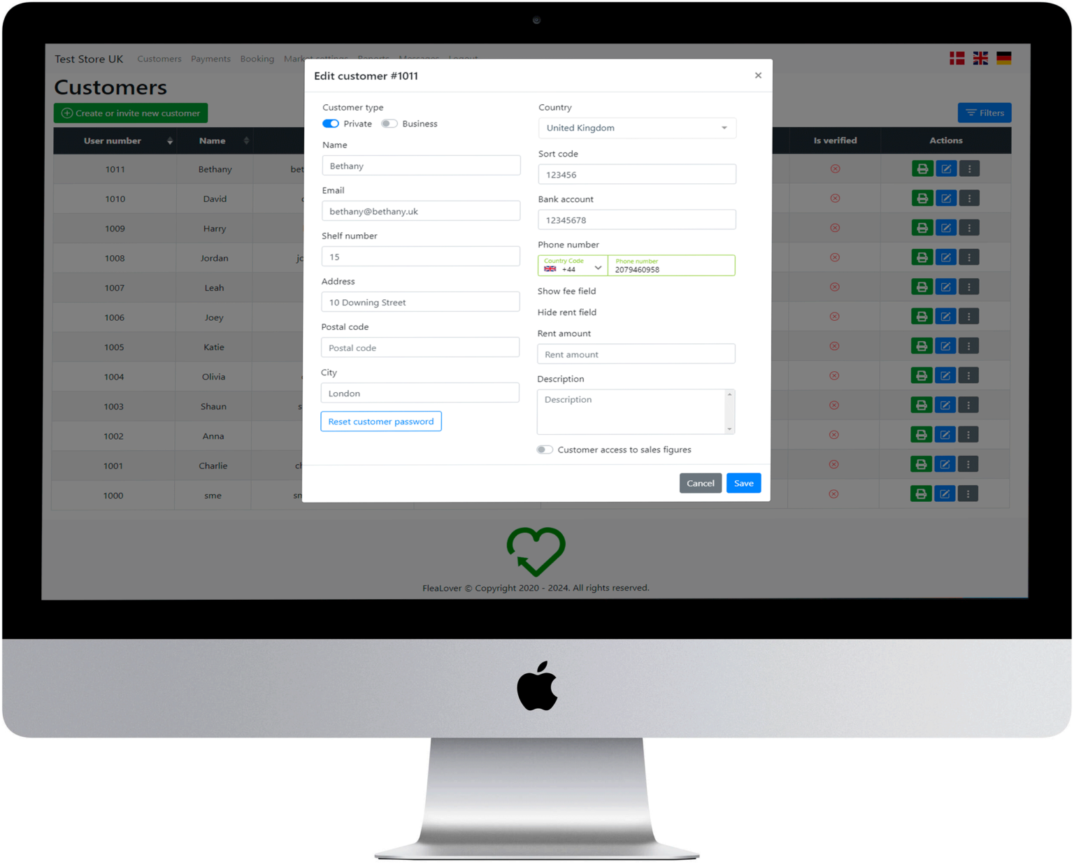 Flea Lover erbjuder en komplett uppsättning funktioner som hjälper dig att hantera kunder, produkter, bokningar och utbetalningar. Du kan bjuda in kunder att få tillgång till systemet via webb-inloggning eller appar för iOS och Android, så att de kan följa sina försäljningar när som helst och utan ansträngning!
